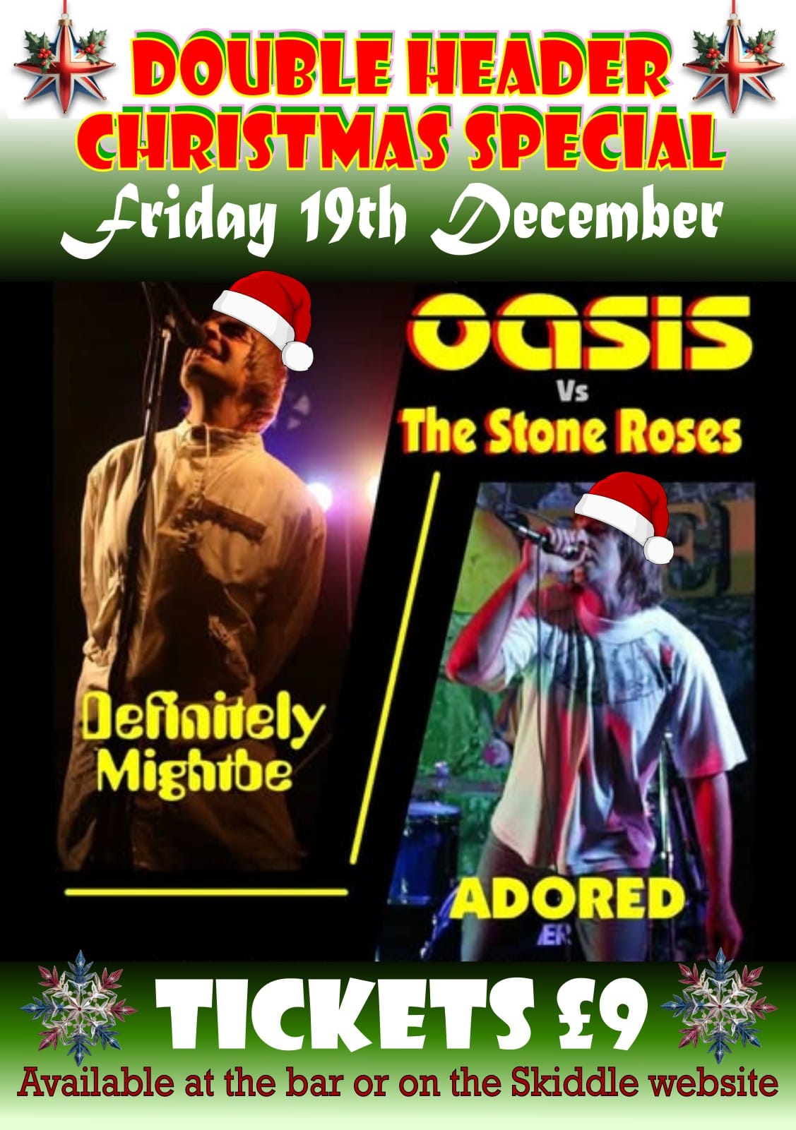 Begin the festivities watching two of the UK’s best tribute bands ADORED and DEFINITELY MIGHTBE go head-to-head. Also with an Indie/Christmas Disco